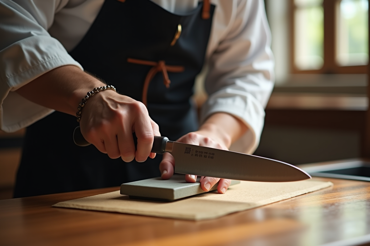 La méthode honbazuke incarne le raffinement japonais : trois pierres, trois étapes – dégrossir, affûter, polir – pour atteindre le fameux tranchant miroir. Ce rituel, respecté par les chefs comme par les passionnés éclairés, prolonge la vie du fil et garantit une coupe sûre, jour après jour.
